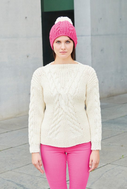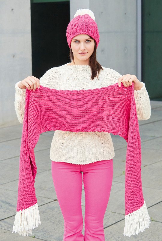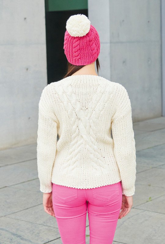 Toll, was man mit Zöpfen alles kreieren kann! Bei diesem weißen Pulli aus Schurwolle-Mischgarn laufen zwei Zöpfe aufeinander zu und wieder auseinander. Das ist etwas tricky, aber es gibtes eine große Strickschrift, nach der gut zu arbeiten ist. Dafür sind die Einzeltteile ganz gerade und unkompliziert geschnitten. Zwischen den Zöpfen verlaufen schmale Rippen. Eine Taillierung ergibt sich ganz automatisch durch den Zopfverlauf. Dazu passt die Mütze und der Schal in Pink mit weißem Bommel bzw. weißen Fransen. Eine Anleitung steht für die Größen 36/38, 40/42 und 44/46 zur Verfügung.