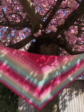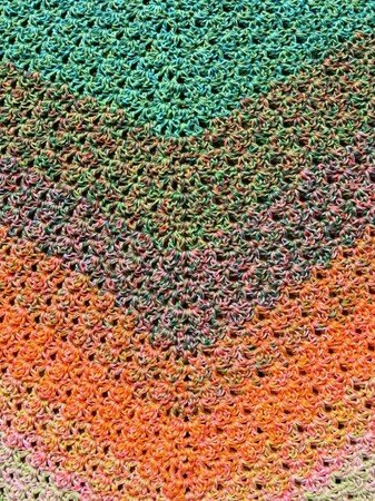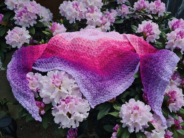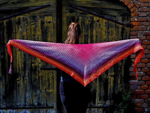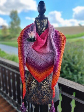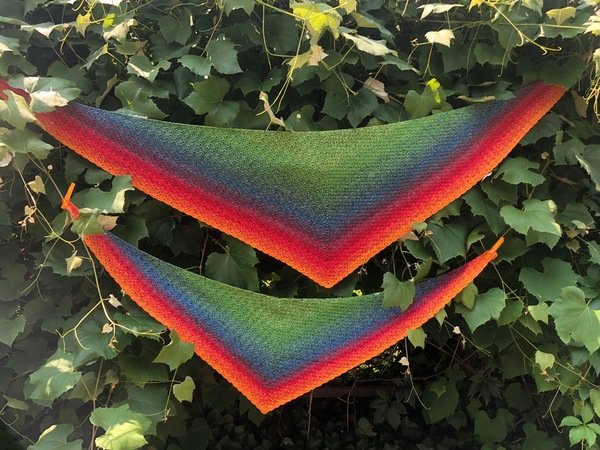 Bei Farbverlaufsgarn empfehle ich je nach Wunschgröße und Häkelstil für ein Kindertuch eine Lauflänge ab 500 m 4-fädig bzw. für ein Erwachsenentuch ab 900 m 4-fädig und eine dazu passende Nadelstärke.