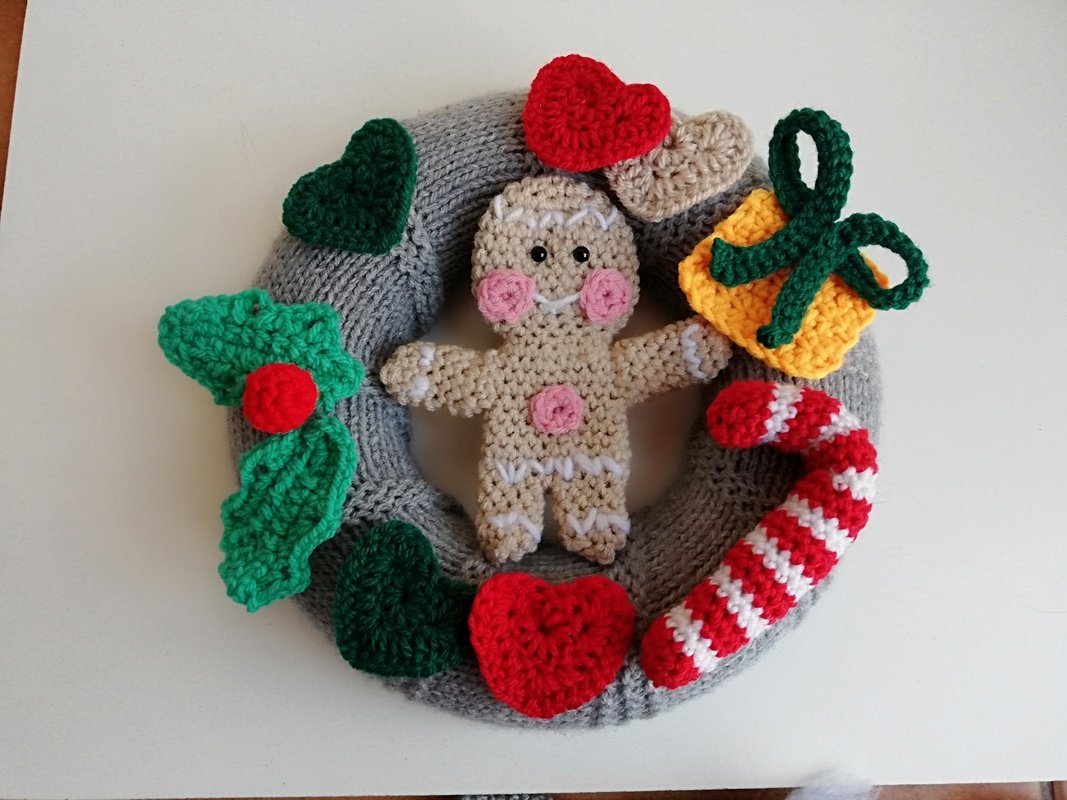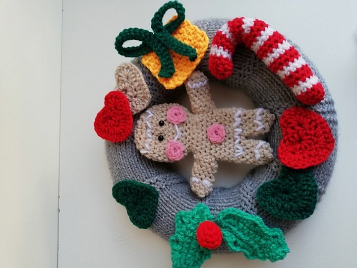 Der Kranz wird grau umstrickt, danach wird alles gehäkelt. Also alle Applikationen, die sich auf dem Kranz befinden, der jede Tür perfekt schmücken wird.