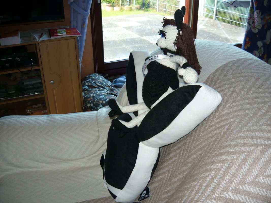 1) Natürlich Wolle und eine Häkelnadel. Ich habe mit Schachenmayr Bravo Schwarz und Weiß und Nadelgröße 3,0 gearbeitet. Außerdem eine Catania Farbe für die Haare.