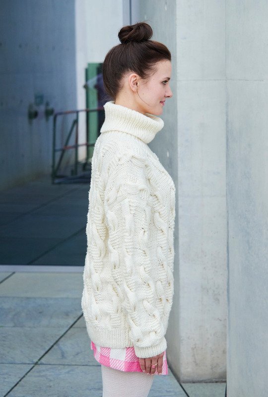 Winterweiß aus edlem Schurwolle-Kaschmir-Mischgarn lässt dich dieser dicke Skipulli bestimmt nicht frieren. Das besondere Zopfmuster aus glatt rechten und kraus rechten Strängen ist unterbrochen von glatt links gestrickten Partien und wird mit Nadeln Nr. 7 gearbeitet. Alle Bündchen und der Rollkragen sind in 1/1-Rippen gearbeitet. Die bis über die Hüften reichende Länge versteckt geschickt eventuelle Pölsterchen. Und der besonders hohe Rollkragen lässt sich entweder mehrfach umschlagen oder gecrumpelt tragen. Eine Anleitung steht in den Größen 38/40 und 42/44 sowie 46/48 zum Download bereit.