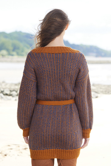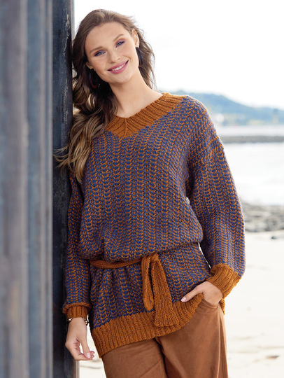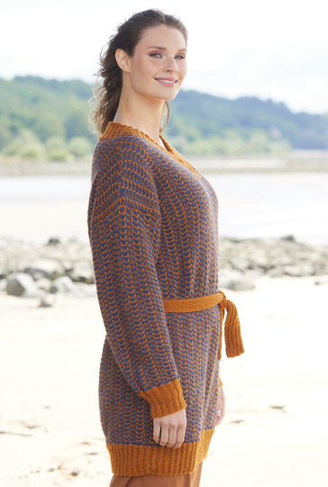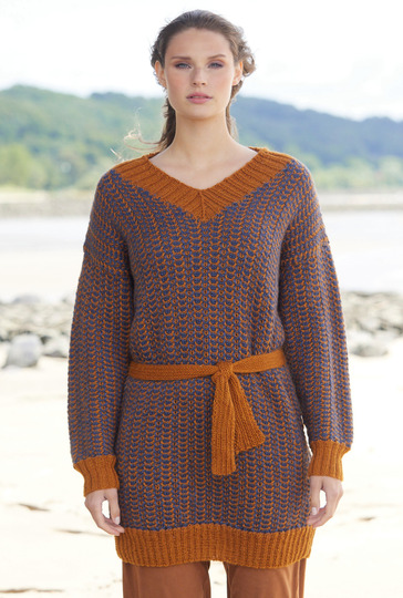 Ob als Kleid oder als Pulli mit dem gestrickten kupferfarbenen Gürtel hochgeschoben und so verkürzt, dieses Modell hat viele Fähigkeiten. Für das interessante verzopfte Hebemaschenmuster werden stets nur zwei Reihen in einer Farbe, entweder Kupfer oder Dunkelblau, gestrickt und die dabei abgehobenen Maschen danach verkreuzt. Die hohen Bündchen und die breite V-Ausschnittblende werden in 2/2-Rippen in Kupfer gearbeitet. Wir empfehlen dafür das edle Garn aus einer Mischung von Mohair, Lamawolle und Seide. Du kannst die Anleitung für den Longpulli bzw. das Kleid in den Größen 38/40, 42/44 und 46/48 downloaden.