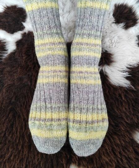 Die fertigen Socken ziehen sich durch das elastische Rippenmuster zusammen und wirken "klein". Aber keine Angst, angezogen am Fuß entfalten sie ihre volle Schönheit. Durch das elastische Muster behalten sie lange Zeit ihre Passform und leiern auch bei ausgiebigen Tragen nicht aus.