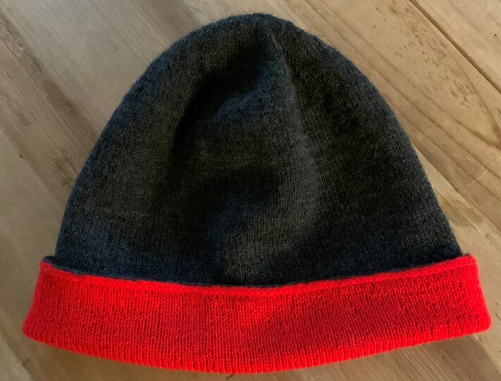 „Anic“ ist eine doppellagige „feine“ Mütze aus reiner Merinowolle. Man kann sie von beiden Seiten tragen. Es werden zwei Mützen gestrickt, beide mit einem kleinen I-Cord abgekettet und dann ineinandergefügt und zusammengenäht. Sie ist lang genug gearbeitet, um sie am Rand umzuschlagen, damit sitzt sie „warm“ an den Ohren.