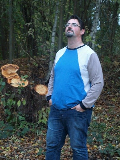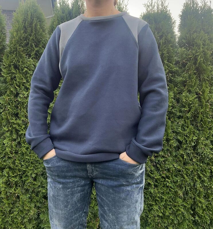 Ein Sweater / Pullover im lässigen Schnitt, mit der üblichen College-Teilung dieser Reihe, ohne Schulternaht aber zusätzlich noch mit horizontaler Teilung am Rücken (um nicht so viel Stoffverbrauch zu haben).