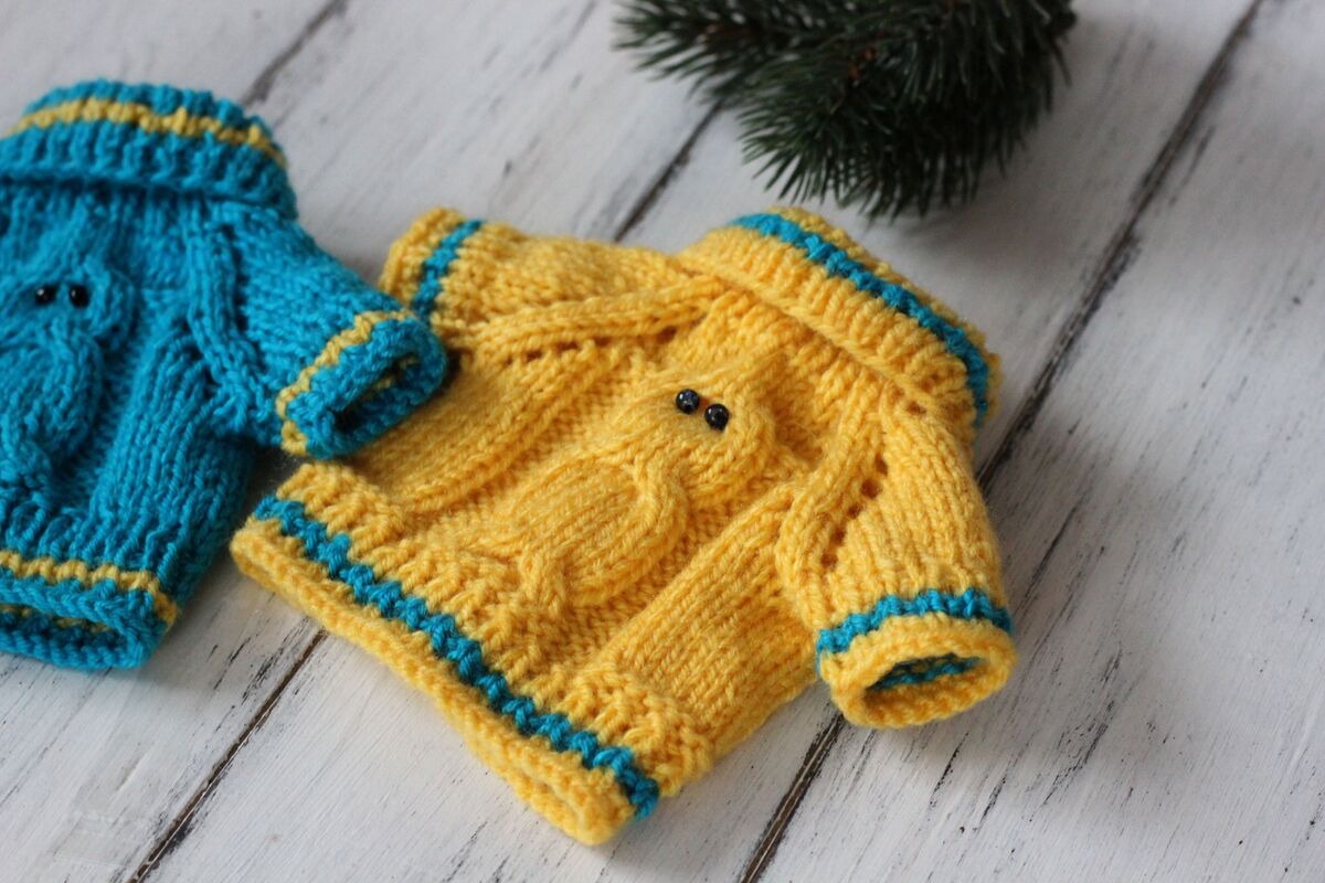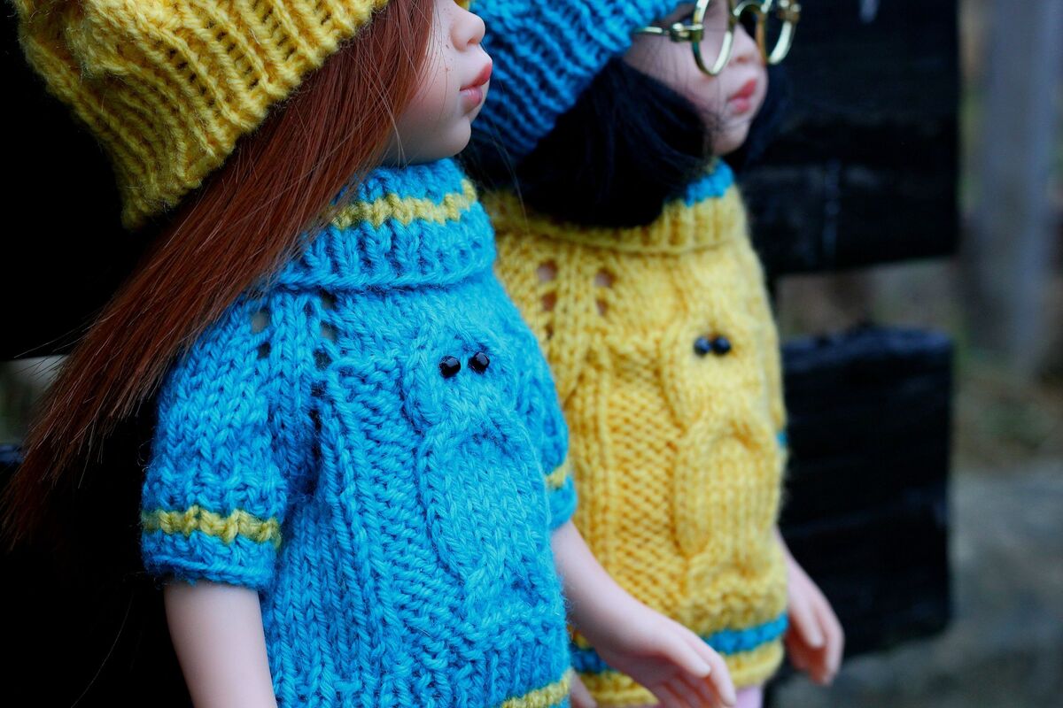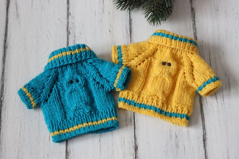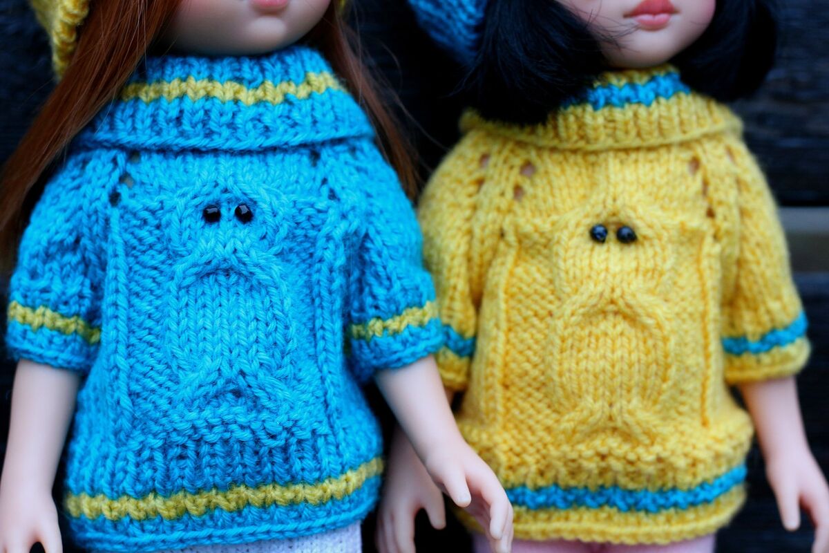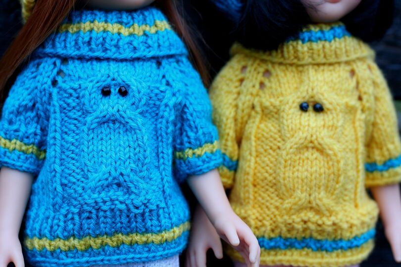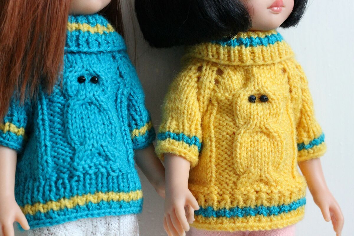Ein schöner Puppenpulli aus weicher Wolle mit schönem Eulenmuster. Ein ideales Geschenk für die Tochter oder Enkelin!
