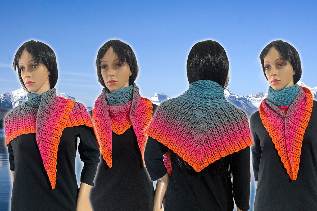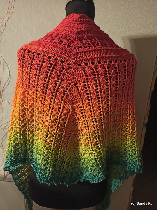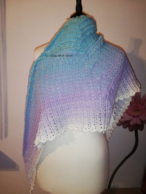 Es ist ein flaches Dreieckstuch aus 5 verschiedenen Mustern.