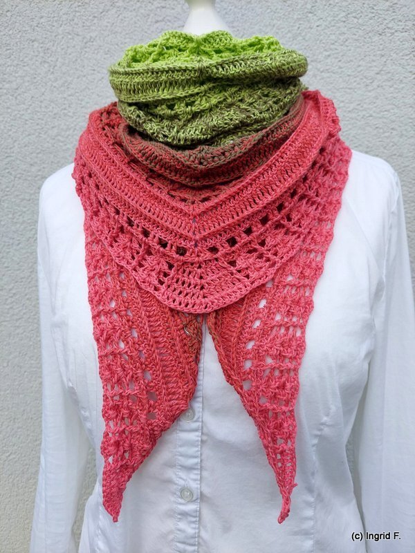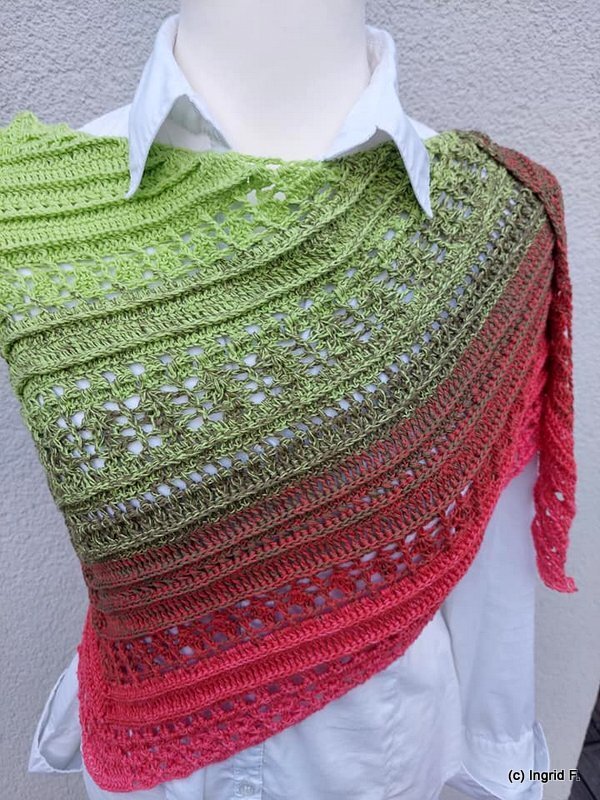 Das Tuch im Titelbild wurde mit 750 m des 4-fädigen Bobbel "Sommerparty" von Funny Hooks und einer NS 3,25 mm, 165 x 50 cm groß.