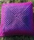 Ich habe für mein Kissen mit Rüschen ca. 700 m LL eines Bobbels von Steffis Wollbobbel verarbeitet und eine Häkelnadel in Größe 5 benutzt. Mein Kissen ist 30 x 30 cm groß. Wenn Du keine Rüschen machen möchtest, kannst Du ca. 50 m LL abziehen.