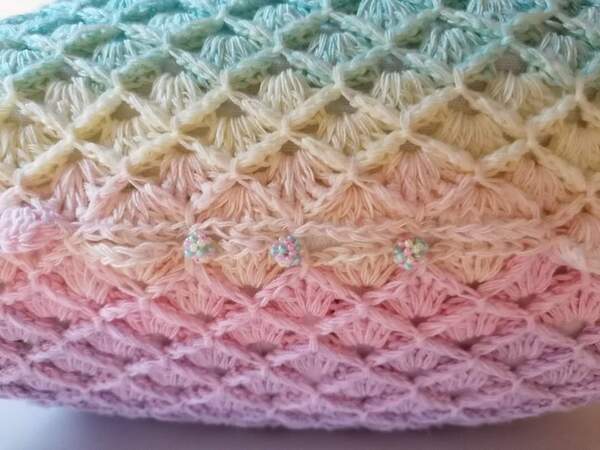 Die Rüschen (optional) lassen das Kissen verspielt aussehen oder verziere es mit Perlen wie das Model in Pastellfarben, dann wirkt es direkt edel. Ein Farbverlaufsgarn kann ich auch empfehlen, da die Kissenhülle aus der Mitte heraus gehäkelt wird. Wenn Du beide Seiten farblich gleich haben möchtest, bieten sich evtl. Ärmelbobbel an.