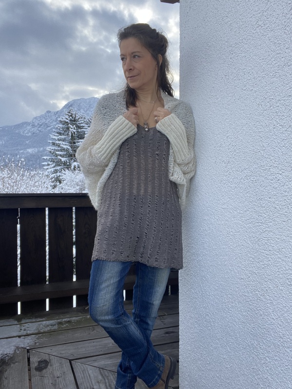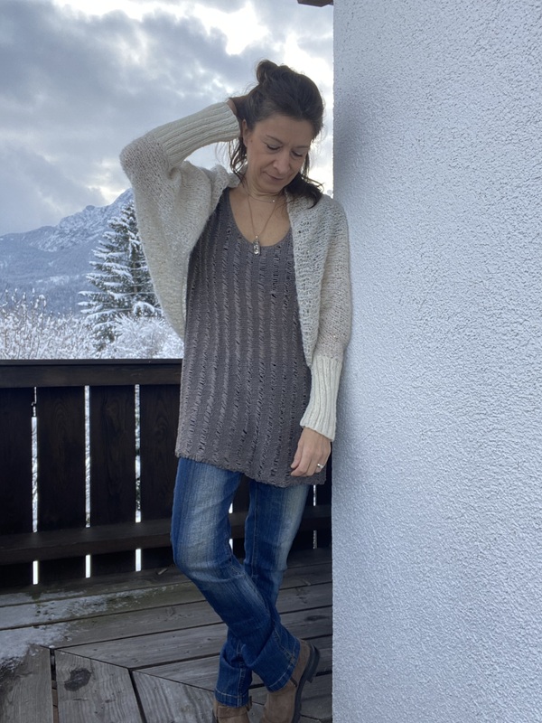 Die vielseitige und leichte Jacke ist schnell mit dicken Nadeln gestrickt. Das fluffige Garn enthält kleine Goldpailletten, die sehr dezent sind und dennoch jeden Look veredeln. Die Ärmel werden aus weichem Alpaka-Garn gearbeitet.