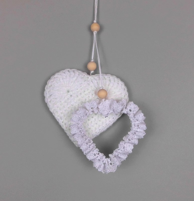 In der Anleitung zeige ich Dir natürlich auch, wie Du die Herzen aus Perlen oder Spitzen-Bordüre selbst machen und die hier gezeigten Dekohänger gestalten kannst.