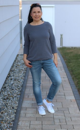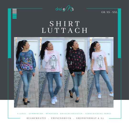 LUTTACH ist ein Basic-Shirt in A-Linie mit vielen Varianten. Du kannst LUTTACH mit einem Gummisaum, normalen Saumabschluss oder einem Bündchen nähen.