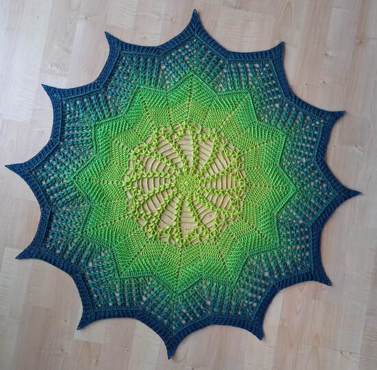 Der Durchmesser ist, je nachdem wie fest oder locker gehäkelt wird, etwa 75-80cm