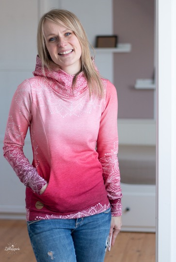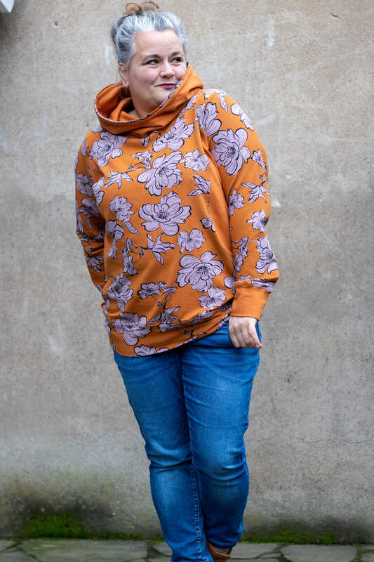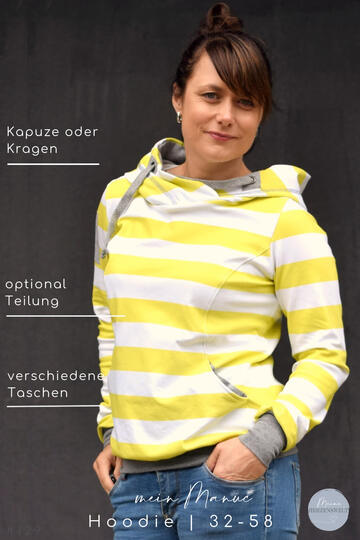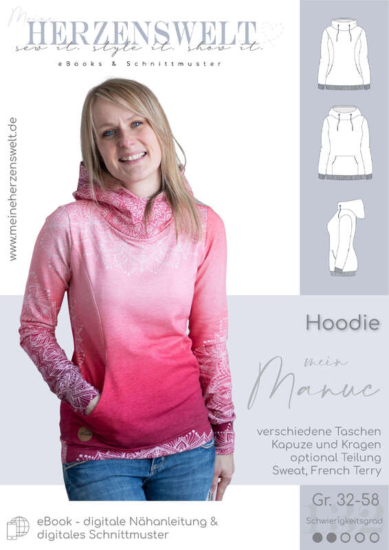 Mit unserem Schnittmuster Manuc bekommst du einen Schnitt für einen Hoodie bzw. einen Pullover mit Kapuze, Kragen oder Halsbündchen.