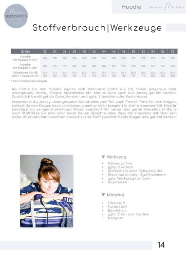 Stoffwahl: Für Manuc eignen sich etwas dickere dehnbare Stoffe wie z.B. Sweat, French Terry und ähnliche Stoffe. Auch dünnere Stoffe wie z.B. Jersey sind möglich. Zusätzlich benötigst du Bündchenware, Kordeln, Ösen und evtl. Vlieseline zur Verstärkung.