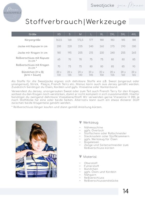 Stoffwahl: Für Manuc eignen sich etwas dickere dehnbare Stoffe wie z.B. Sweat, French Terry und ähnliche Stoffe. Auch dünnere Stoffe wie z.B. Jersey sind möglich. Zusätzlich benötigst du Bündchenware und einen Reißverschluss, Kordeln, Ösen und evtl. Vlieseline zur Verstärkung.