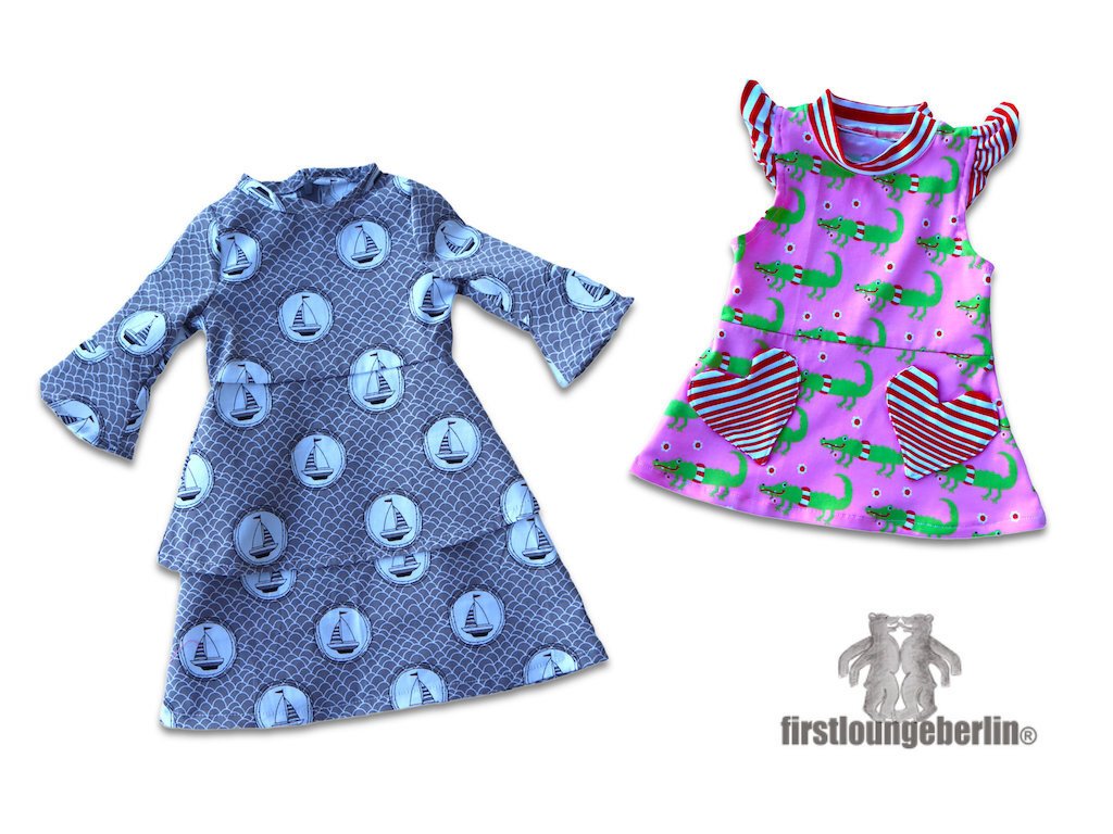 Lena Kleidchen für Babys & Kinder in 22 Einzelgrößen von Größe 38 bis 164. Nähanleitung mit Schnittmuster für Jersey oder Baumwoll-Kleidchen mit seitlichen Taschen oder mit aufgenähten Herz-Taschen. Trompetenärmeln, Flügelärmeln, im Lagenlook, kurz oder länger. Mit Reißverschluss bei nicht dehnbaren Stoffen. Mit vielen Tipps!