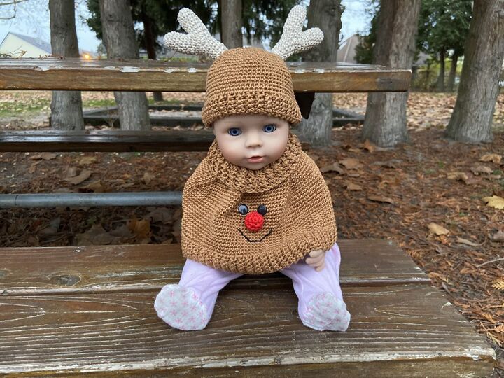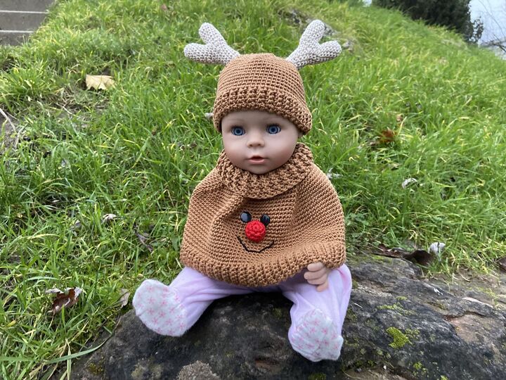 Mit dem Puppenset „Melly“ ist das Puppenkind für die kalte Jahreszeit ideal angezogen: Poncho mit passender Mütze im Elch-Style... das bringt das Herz jeder Puppenmama zum Schmelzen.
