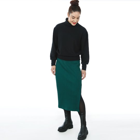 FRAU IRMA ist ein blitzschnell genähter, schlanker Bleistiftrock. Ein langer Schlitz in der Seitennaht garantiert die volle Bewegungsfreiheit. Die Midilänge passt zu Boots oder Sneakern genauso gut wie zu Sandalen oder High Heels. Ein unkomplizierter Rock für viele Gelegenheiten!