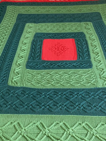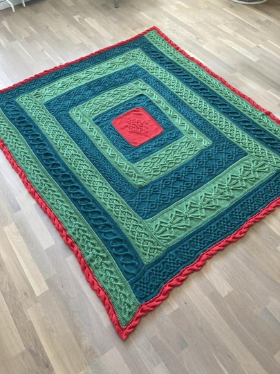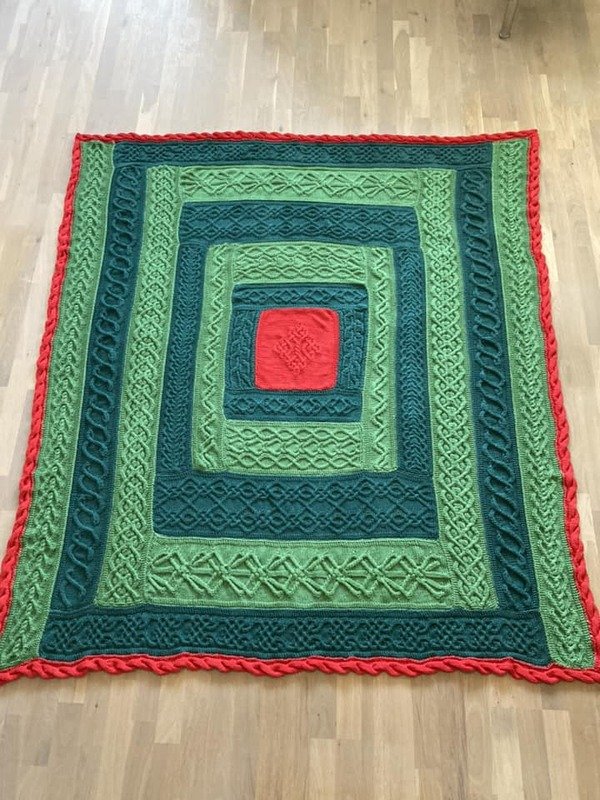 Die Decke besteht komplett aus keltischen Zopfmustern und wird in Streifen gearbeitet, die am Ende zusammengenäht oder -gestrickt werden.