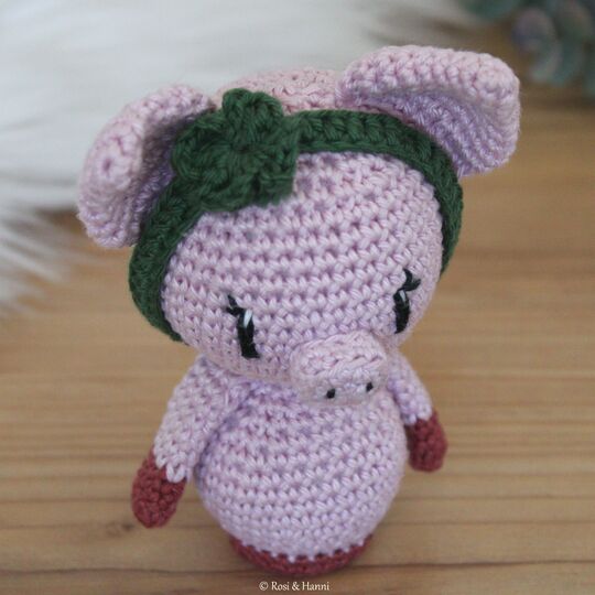 "Glücksschwein Amanda" wird bei angegebener Wolle und Häkelnade ca. 11 cm groß (mit Ohren).