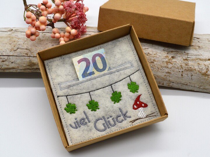 Verschenke Glück und etwas Geld in einem Geschenk, ein kleiner quadratischer Wunscherfüller zum Thema Glücksbringer.