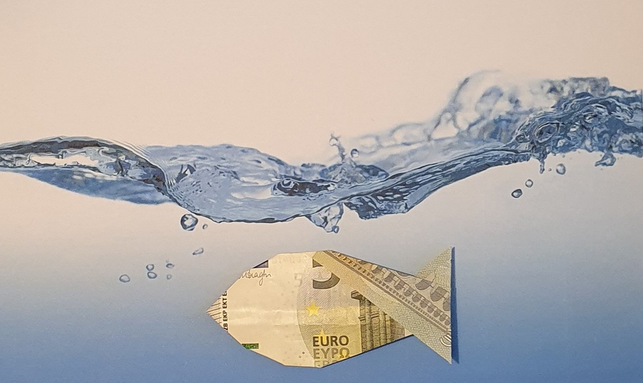 Dieser zweidimensionalen Origami Geldschein Fisch wird aus einem Geldschein gefaltet. Dieser Fisch ist eine sehr stilistische Darstellung eines Fisches. Er kann aus jedem Euro Geldschein oder aus jeder anderen Währung gefaltet werden. Hier im Foto ist er aus einem 5 Euro Geldscheinen gefaltet.