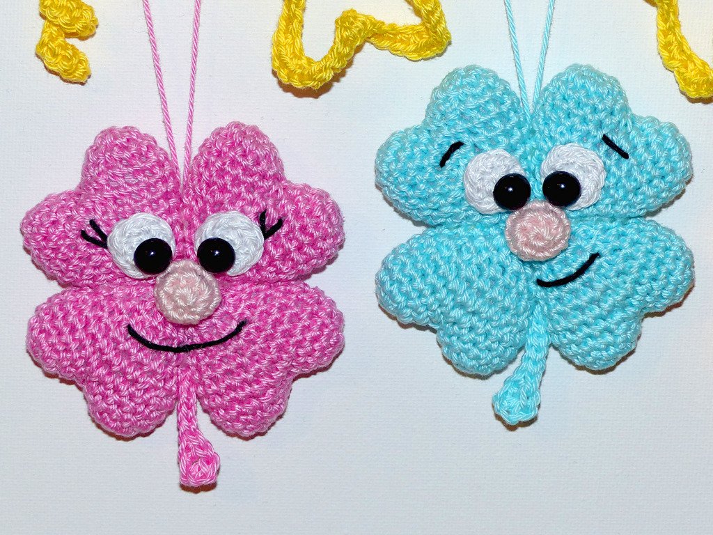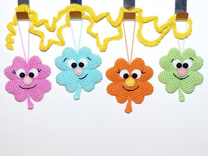 Nicht nur zum Jahreswechsel sind diese drolligen Kleeblätter ein tolles Geschenk. Zu jedem Anlass sind die süßen Glücksbringer ein passendes Mitbringsel, über das sich bestimmt jeder freuen wird. Mit ihren drolligen Gesichtern zaubern sie jedem ein Lächeln ins Gesicht und mit ihren bunten Farben sind sie absolute Gute-Laune-Macher :) Auch als Schlüsselanhänger oder Taschenbaumler sind sie perfekt geeignet. Sie sind schnell gehäkelt und man braucht lediglich ein paar Wollreste.