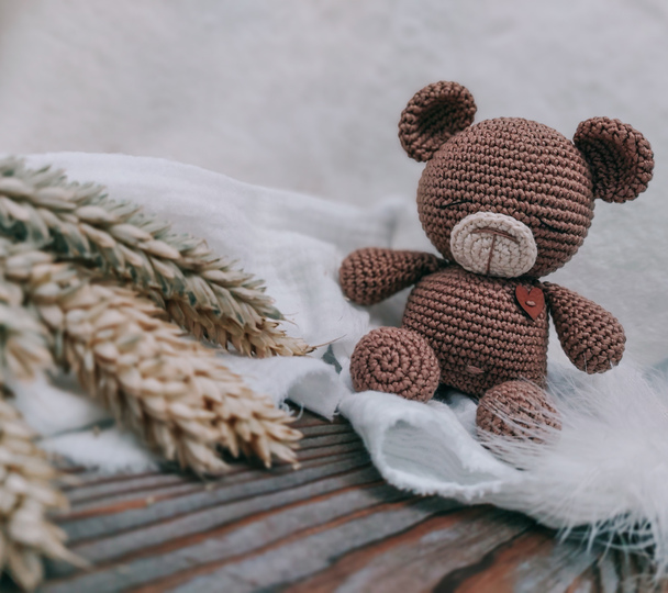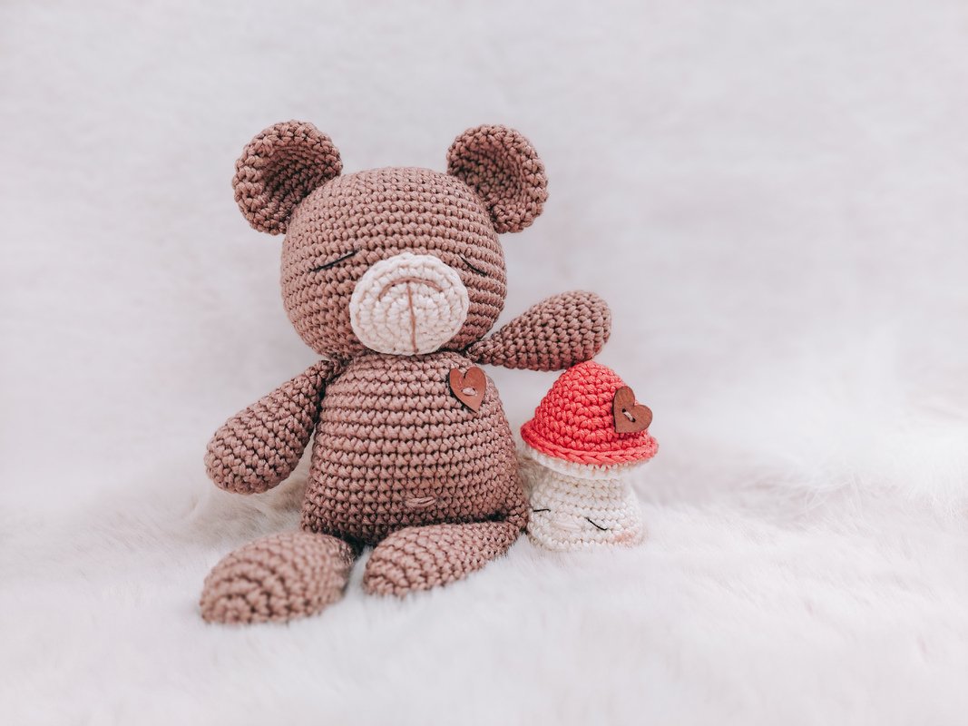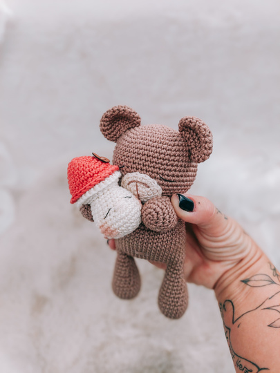 Der kleine gehäkelte Teddybär ist ein süßes Spielzeug / Kuscheltier für Babys und Kinder. Der kleine Bär kommt auch nicht allein, denn er hat seinen Freund, den gehäkelten Pilz dabei. Die beiden sind ein unschlagbares Team und freuen sich auf spannende Abenteuer!