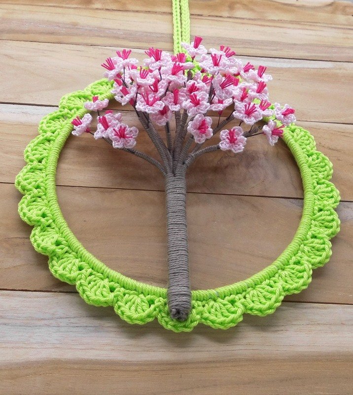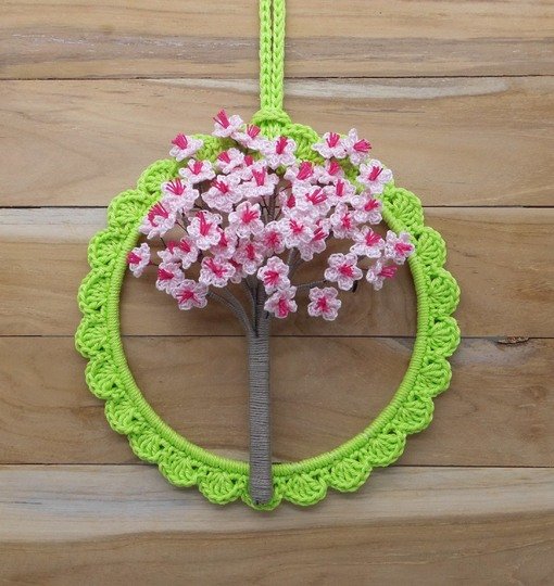 Der 15 cm große Dekohänger mit dem blühenden Kirschbaum kann auch von Anfängern mit etwas Übung ganz einfach aus Wollresten in Deinen Wunschfarben nachgemacht werden.