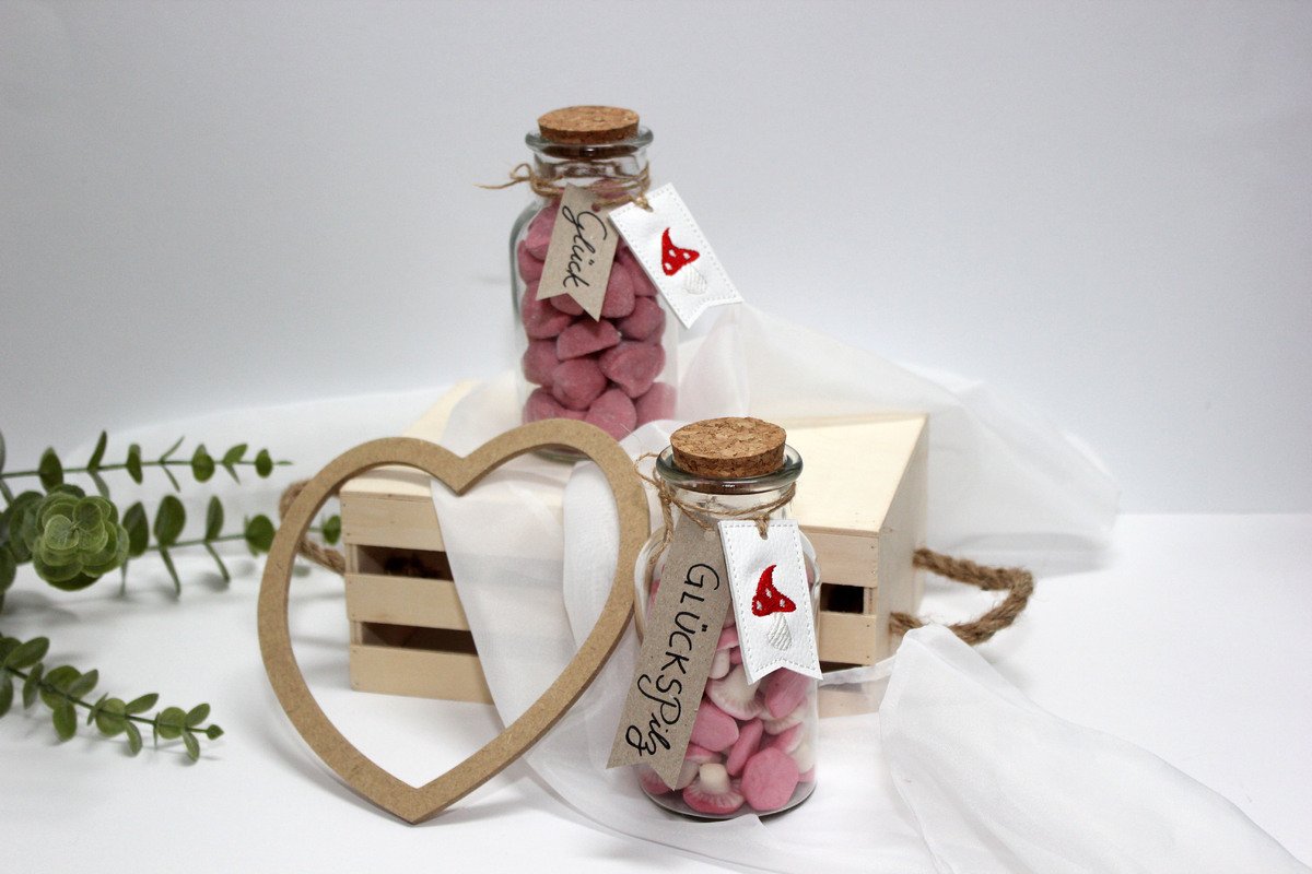 Es werden zwei Anhänger im 10x10cm Stickrahmen gestickt und können als Glücksbringer an Geschenke, Flaschen, Schlüssel oder als Deko an Silvester verwendet werden. Wobei man Glück immer brauchen kann, deshalb auch eine süße Überraschung über das gesamte Jahr verteilt.