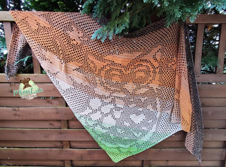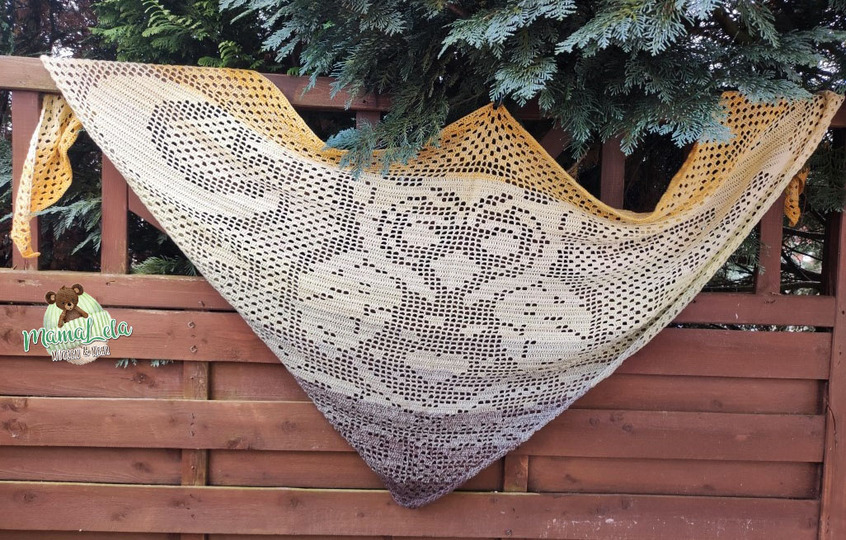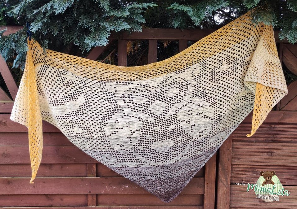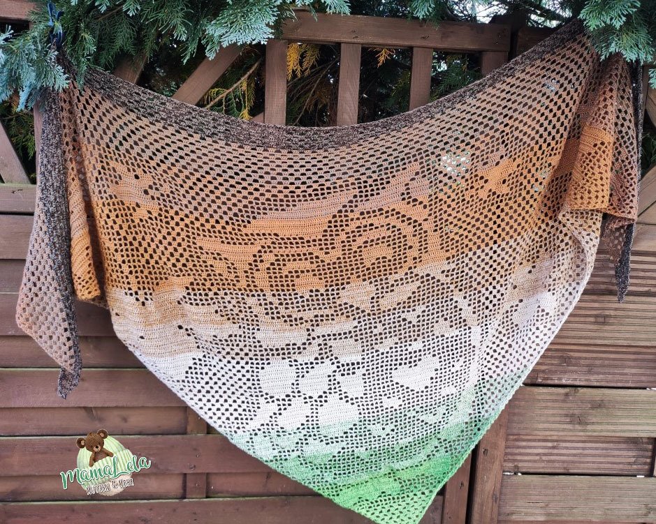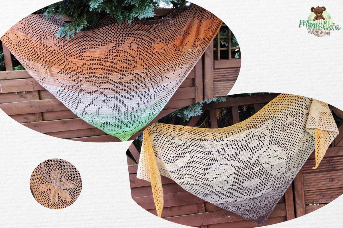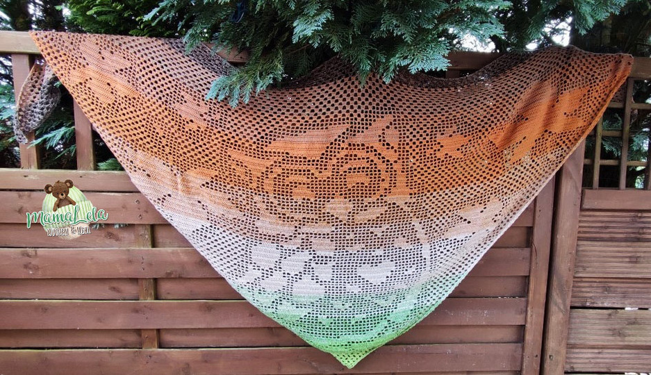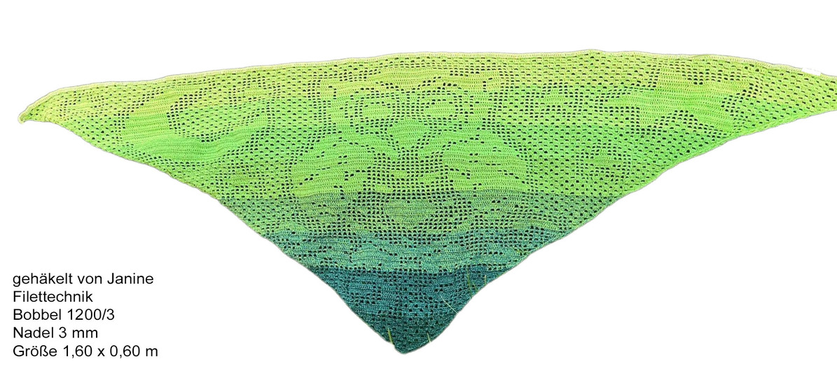 Ein Tuch im Grannymuster wird eher spitz und schmal wohingegen ein Tuch im Filetmuster eher flach und breit wird.