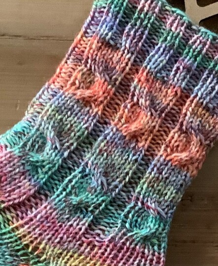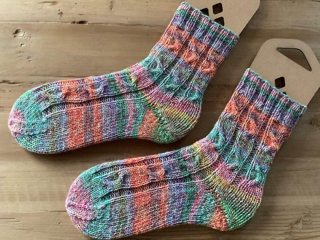 „Almonda“, warme Socken aus 6-fach Sockenwolle mit einem einfachen Zopfmuster. Die Socken werden von oben nach unten gestrickt. Ich habe die Ferse als Bumerangferse gearbeitet und eine Bandspitze gestrickt und beschrieben. Ferse und Spitze können jedoch auch anders ausgeführt werden.