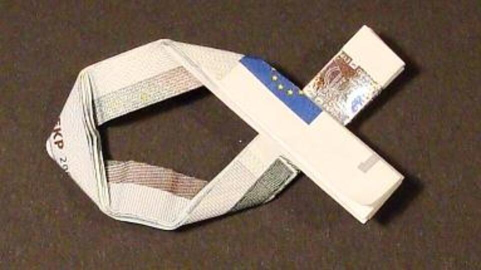Dieser zweidimensionalen Origami Geldschein Fisch wird aus einem Geldschein gefaltet. Dieser Fisch ist eine sehr stilistische Darstellung eines Fisches. Er kann aus jedem Euro Geldschein oder aus jeder anderen Währung gefaltet werden. Hier im Foto ist er aus einem 5 Euro Geldscheinen gefaltet.