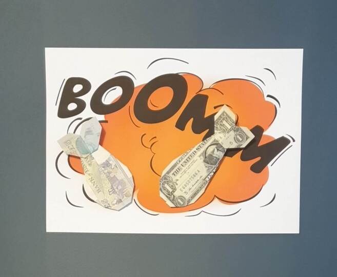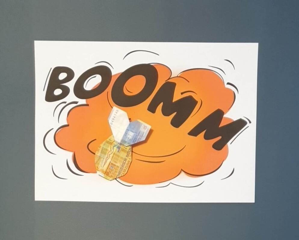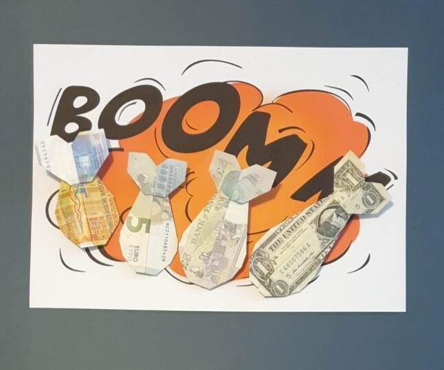 Diese zweidimensionale Origami Geldschein Bombe wird aus einem Geldschein gefaltet. Diese Bombe ist eine 2D Darstellung einer Bombe und sie ist ein Wortspiel und bezieht sich auf das Objekt "Geldbombe". Eine Geldbombe wird in der Regel in den Nachttresore einer Bank eingeworfen. Die Anleitung für das Geldschein Messer "Bestechungsgeld" oder der Geldschein Waffe "Waffenschein" sind ebenfalls Wortspiele.