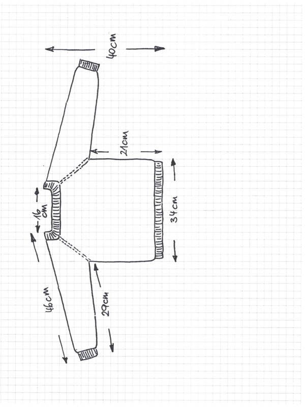 Bei Einhaltung der Maschenprobe 20M und 27R = 10cm ergeben sich die Masse des fertigen Pullovers, wie in der Skizze gezeigt.