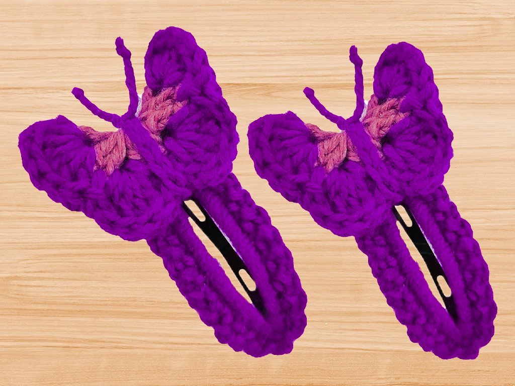Das Häkel-Haarspangenmuster besteht aus einer schriftlichen Beschreibung mit Details und Fototutorials.