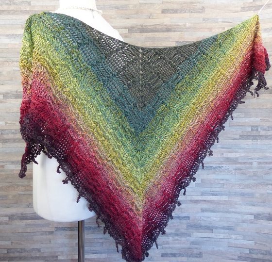 Das Tuch ist ein Wendetuch. Das Muster ist beidseitig gleich. Somit braucht man nicht darauf zu achten und es kann von beiden Seiten her getragen werden. Aufgrund der Relief-Stäbchen ist es etwas dicker und daher schön kuschelig. Als Abschlussborte sind Blüten (Zotteln) angebracht.