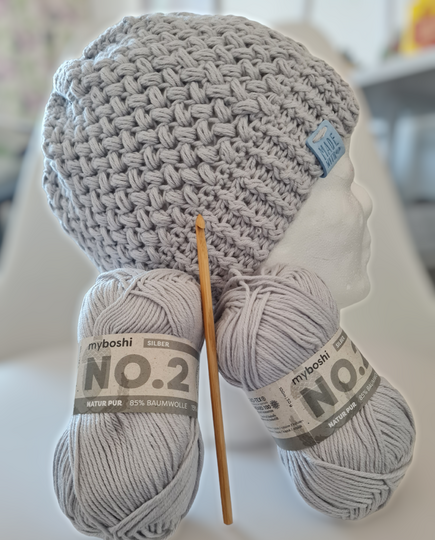 Die Mütze kann in jeder beliebigen Größe gehäkelt werden. Mein Modell habe ich passend für einen Kopfumfang mit ca. 54cm gearbeitet.