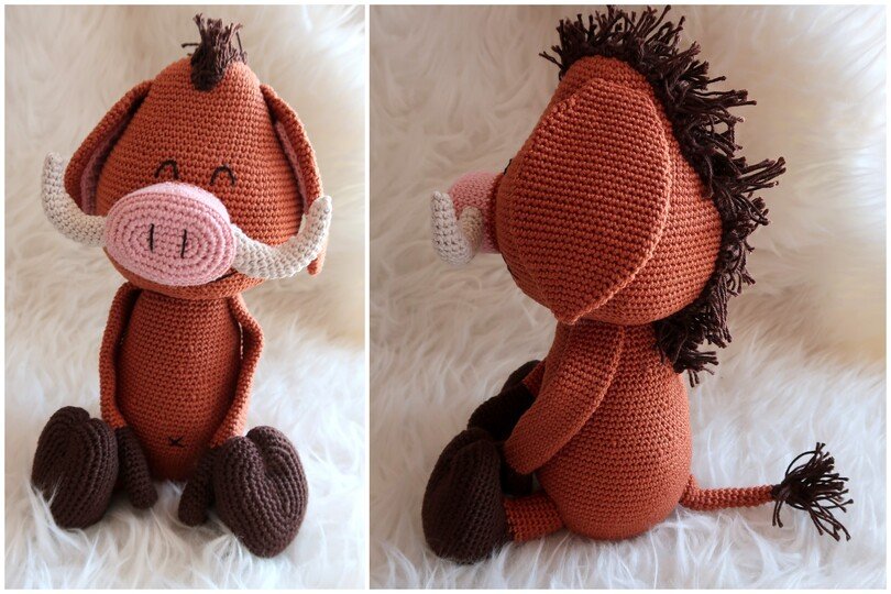 Wenn du mit dem angegebenen Garn häkelst (100% Baumwolle mit 125m LL auf 50g), wird das Warzenschwein ca. 30cm hoch.