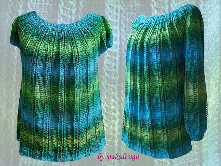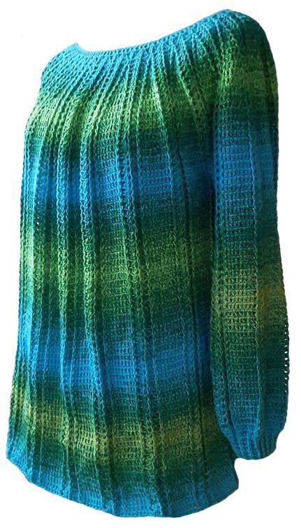 Es kann mit langen Armen, Halbarmen oder kurzen Armen gehäkelt werden.