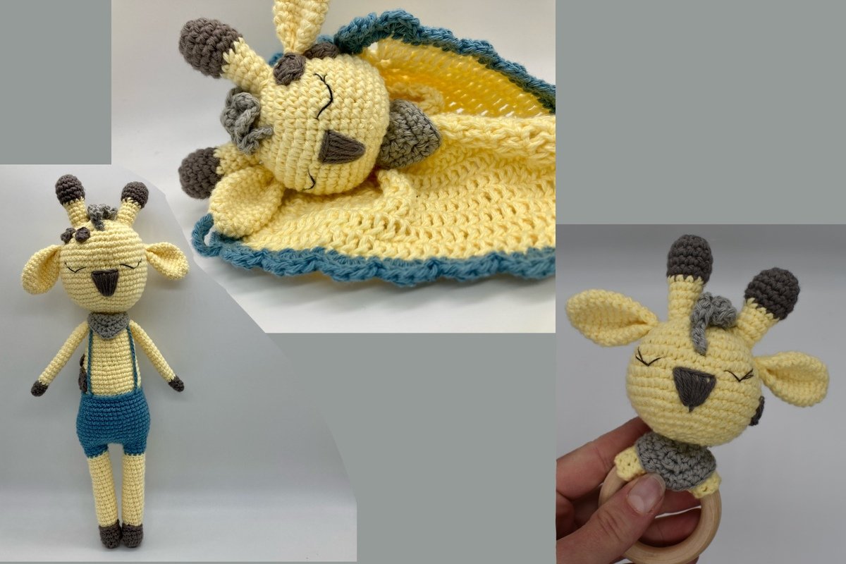 Du erhältst drei ausführliche und bebilderte Anleitungen zur Herstellung von Häkelpuppe Twiga, Schmusetuch Geri und Greifling Gerald im Giraffenmotiv.
