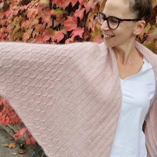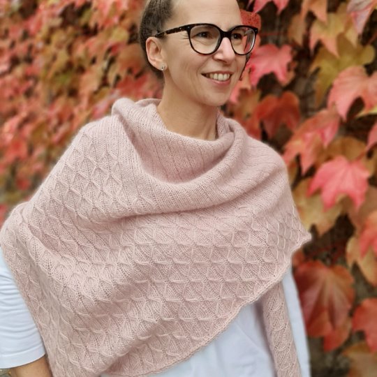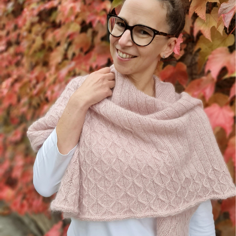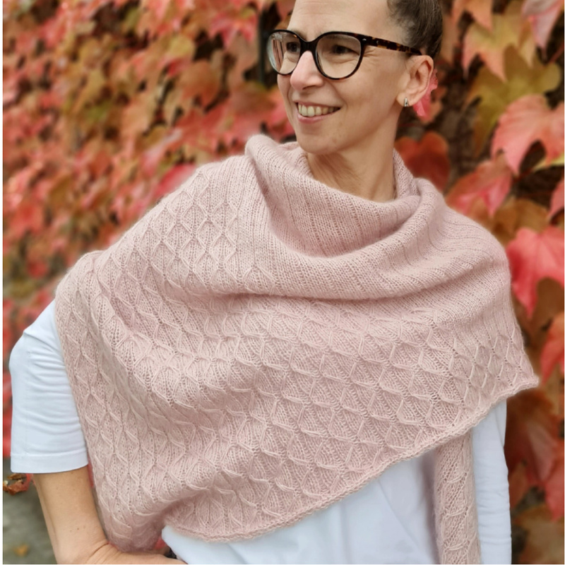 Das Besondere an diesem Tuch ist die Kombination von zwei Garnen, die hier zusammen verstrickt werden. Hier lässt sich wundervoll mit Farben spielen, je nachdem welche Nuancen miteinander kombiniert werden.