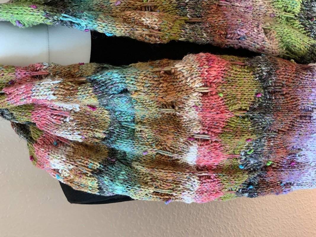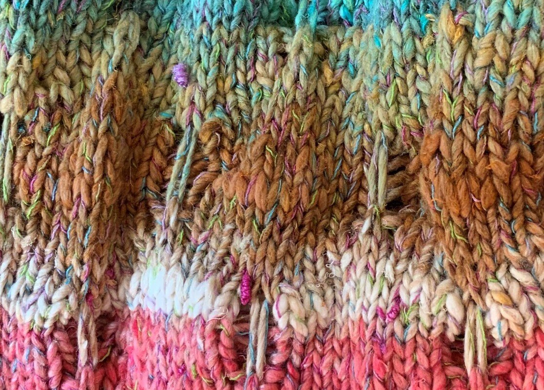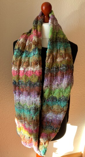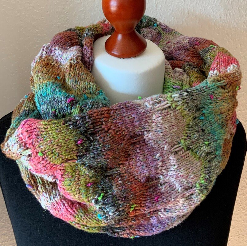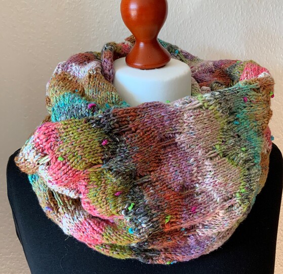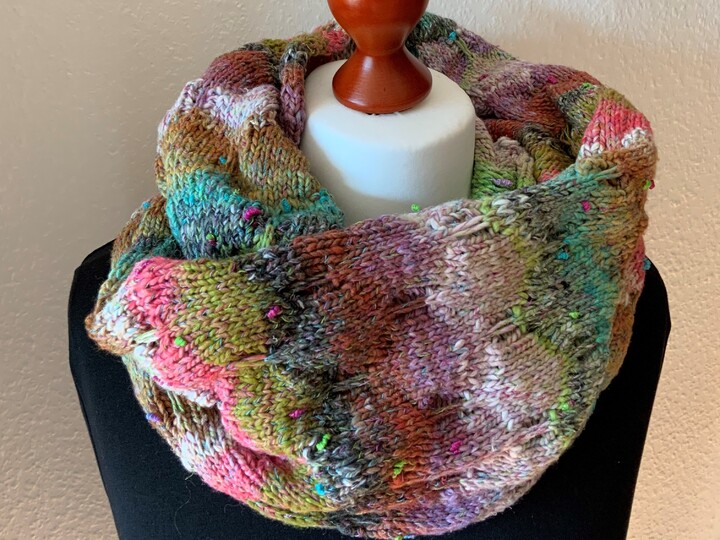 „Alma“ ist peppiger Loop, der durch das verwendete bunte Garn von Noro und ein Muster mit hochgezogenen Maschen ins Auge fällt.