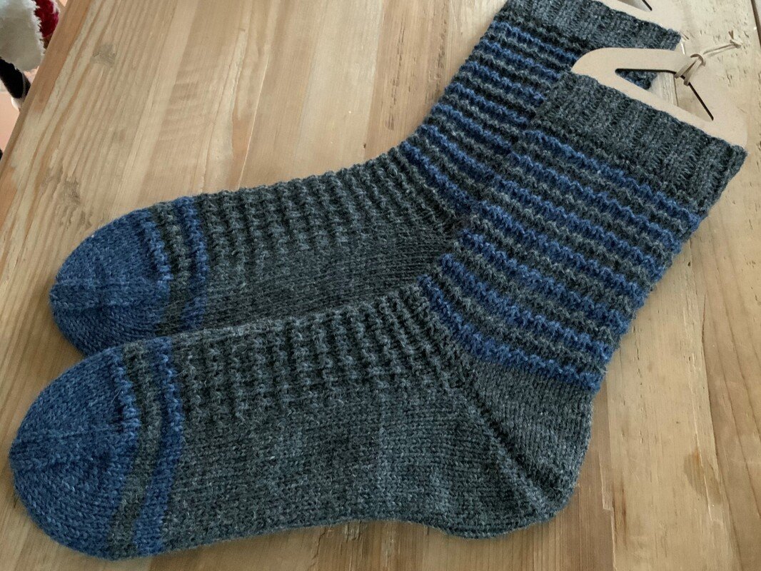 Mustersocken sind aus Online Supersocke, Worker Socks“, in den Farben: dunkelblau und dunkelgrau in der Größe 44/45 gearbeitet. Der tatsächliche Verbrauch lag bei 75 g dunkelgrau und 40 g dunkelblau