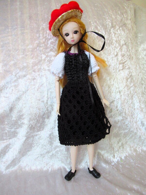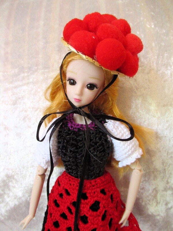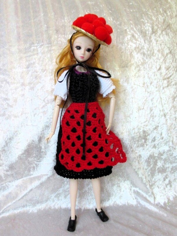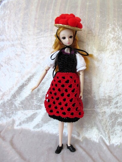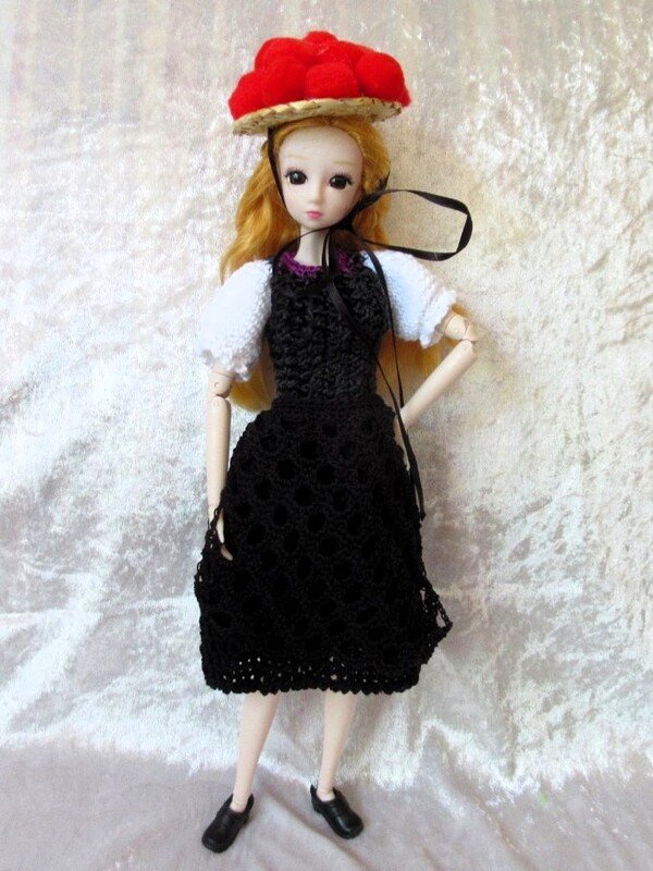 Mit diesem gehäkelten Ensemble kannst du dein Modepüppchen in ein richtiges Schwarzwaldmädel mit Bollenhut verwandeln. Die Schürze der Originaltracht ist schwarz. Wenn du es aber etwas farbiger haben möchtest, passt auch eine rote Schürze sehr gut dazu. Die weiße Bluse ist angehäkelt. Das erleichtert das An- und Ausziehen und trägt nicht so sehr auf.