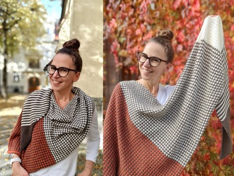Das Tuch wird zweifädig verstrickt, d.h. es wird jeweils ein Faden eines jeden Garnes verwenden. Bei der Kombination aus Ecopuno und Silkhair kommen zwei außergewöhnlich weiche Garne zusammen, die toll zusammenwirken. Besonders schön ist es, dass es beide Garne in sehr ähnlichen Farbtönen gibt, die sich hervorragend miteinander kombinieren lassen.