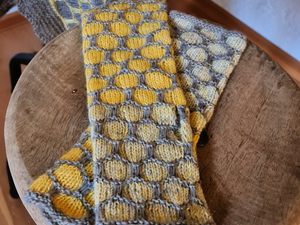 Die Stulpen PHILI habe ich 2018 designt und in der Original-Anleitung aus Gomitolo Puno von Lana Grossa gestrickt. Da dieses Garn zwischenzeitlich nicht mehr erhältlich, aber die Stulpen PHILI – als auch das dazu passende Tuch PHILINE – eines der beliebtesten und meistgestrickten Designs ist, habe ich dieses sozusagen neu aufgelegt und in einer neuen Garnkombination gestrickt. Auf Seite 9 findet ihr die Material-Angaben und auch ein Foto zu den Original-Stulpen.