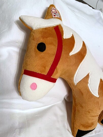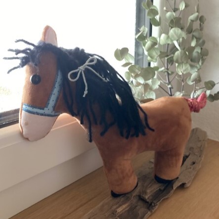 Die Mähne/ Halfter/ Hufen werden appliziert, das Auge und die Nüstern ebenfalls. Für das Auge könnt ihr auch z.B. ein Sicherheitsauge verwenden oder es von Hand aufsticken.